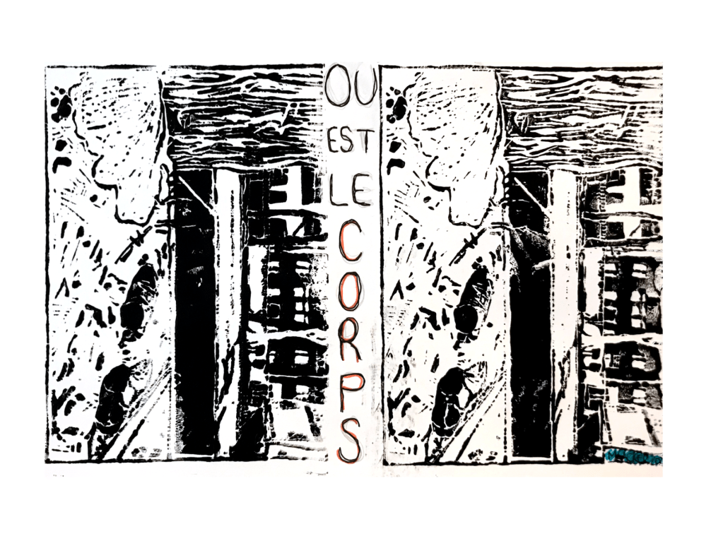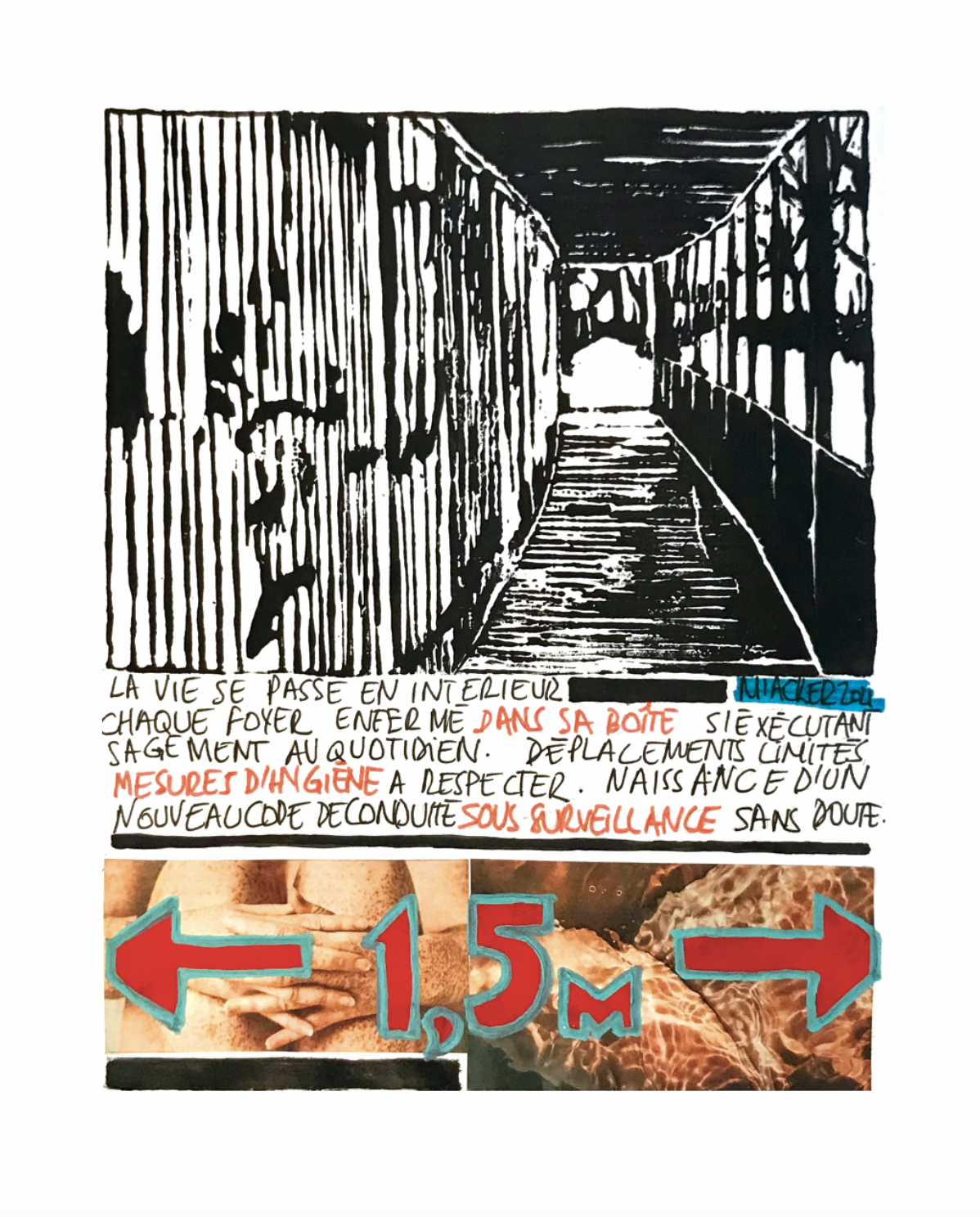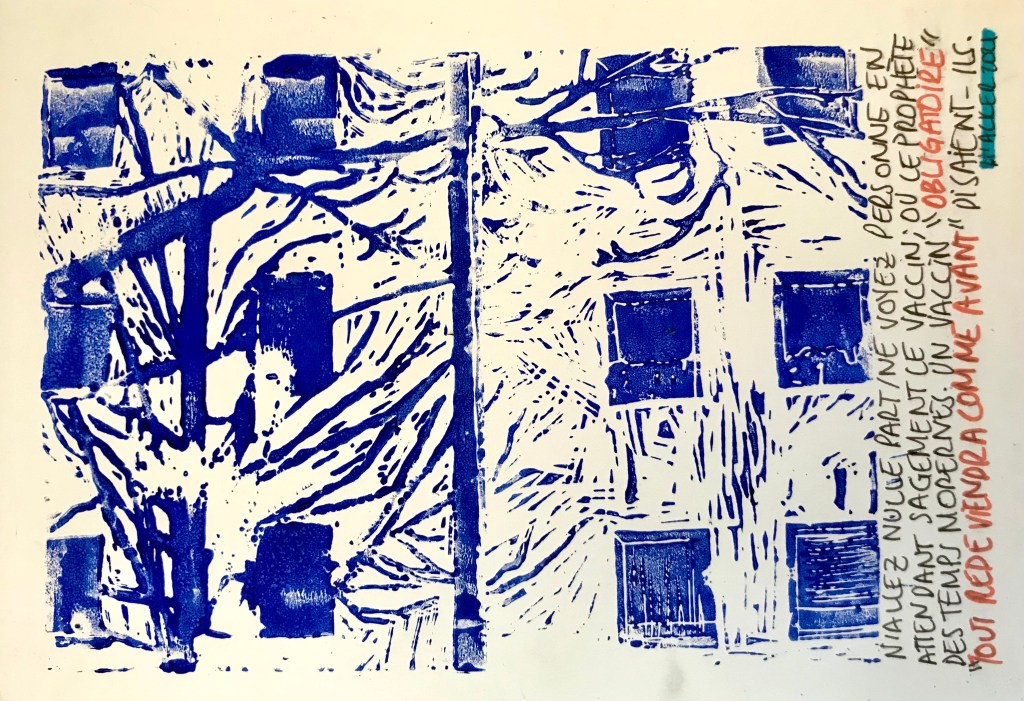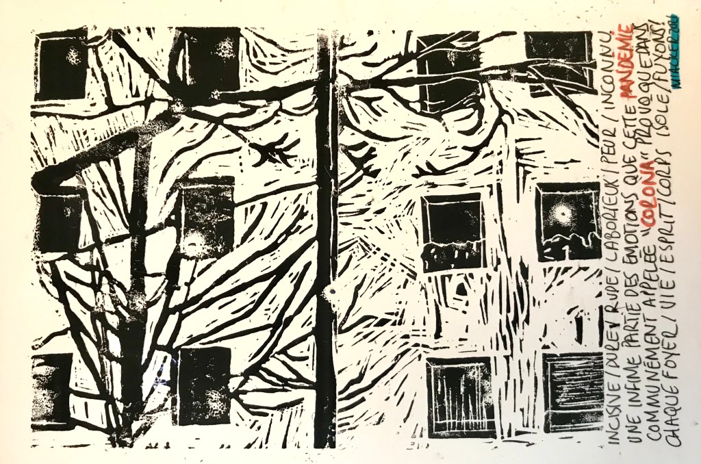 Technique d’impression en linogravure pour rappeler la technique d’édition de la presse, partageant les actualités au monde via des lettres et images imprimées sur du papier/ un support.