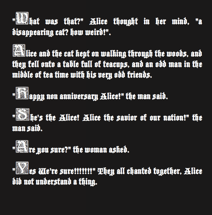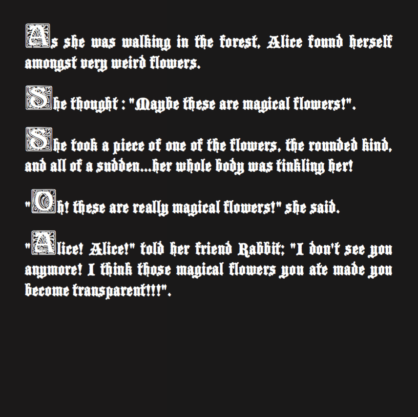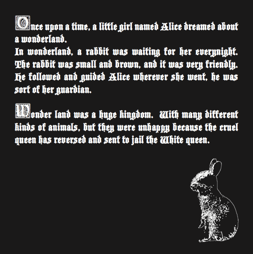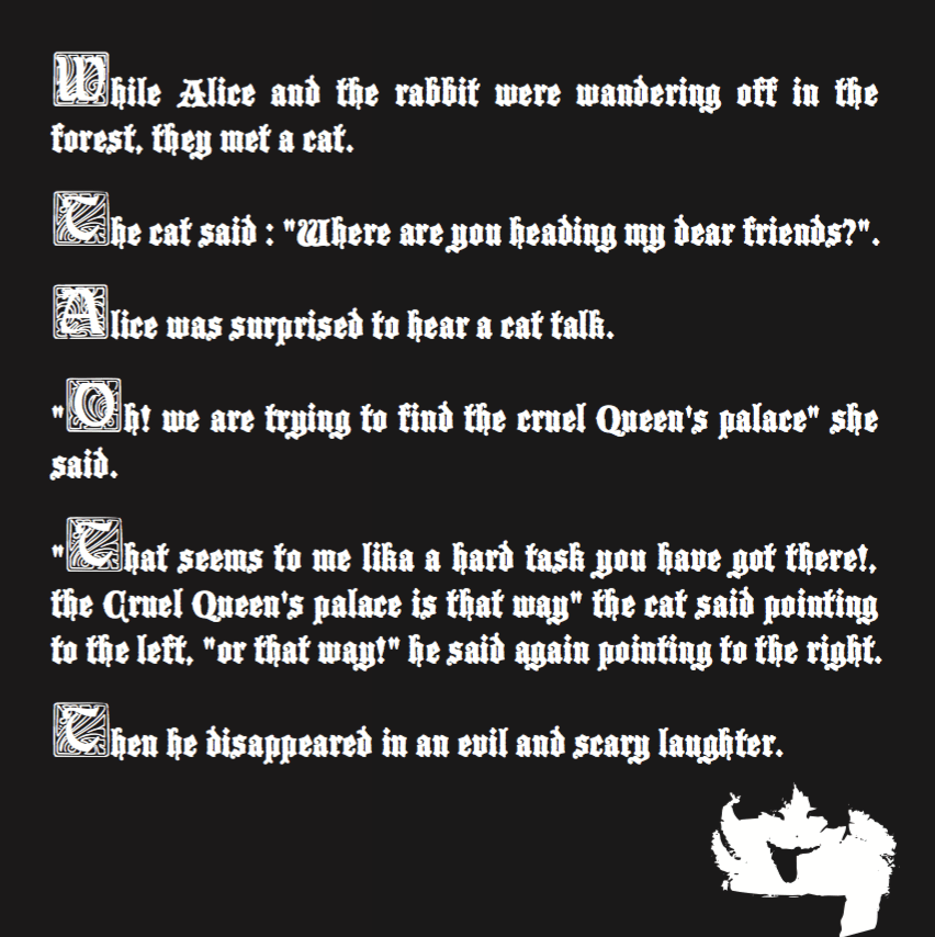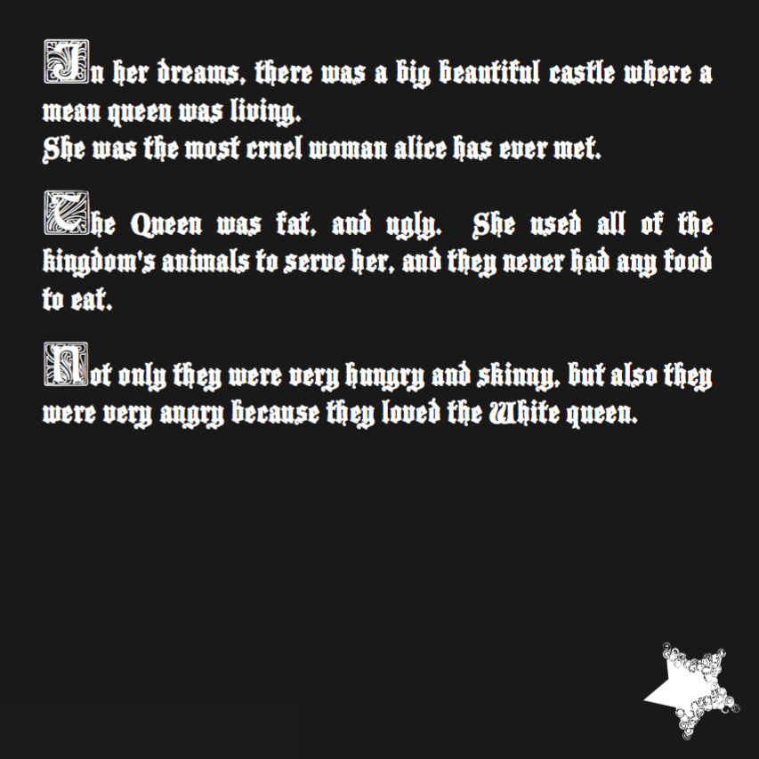 Une ambiance gothique a été manifestement choisie par l’artiste pour retranscrire les émotions qu’Alice aux pays des Merveilles lui a inspirée en tant qu’enfant…la peur, la folie et les premiers pas vers un monde imaginaire.