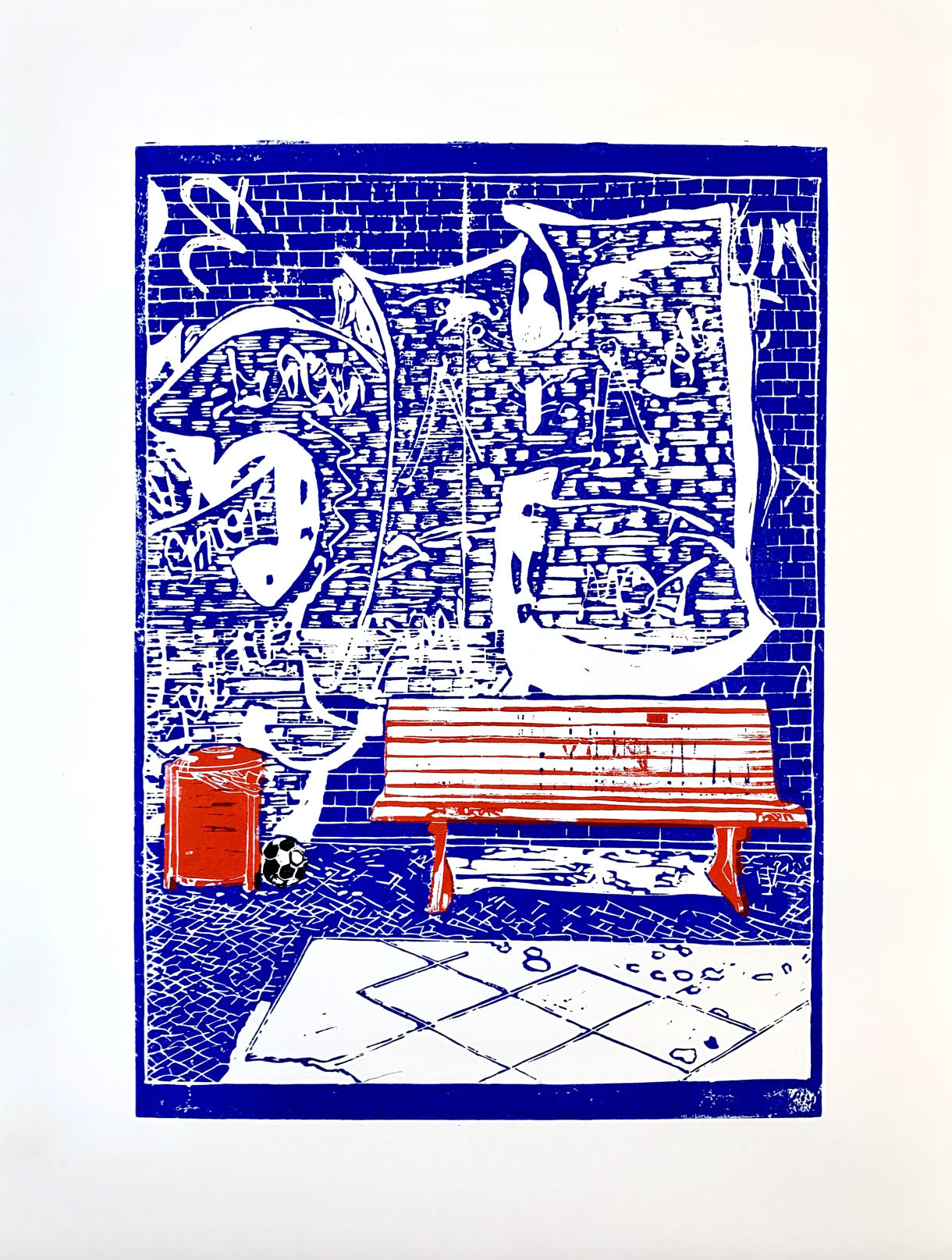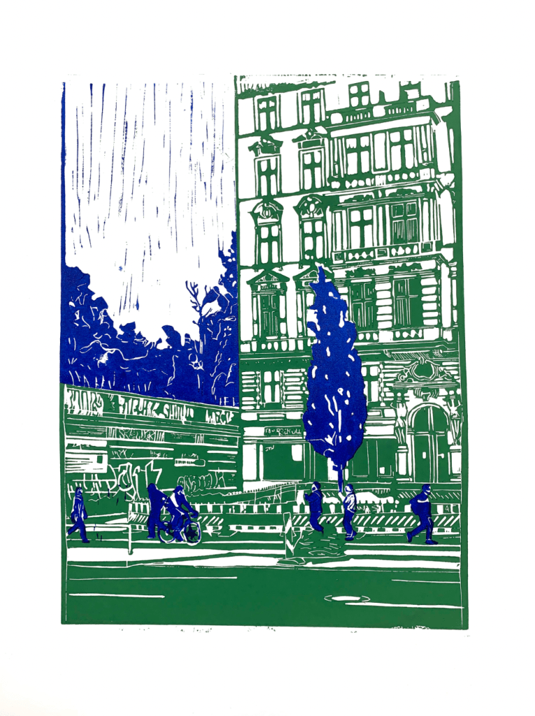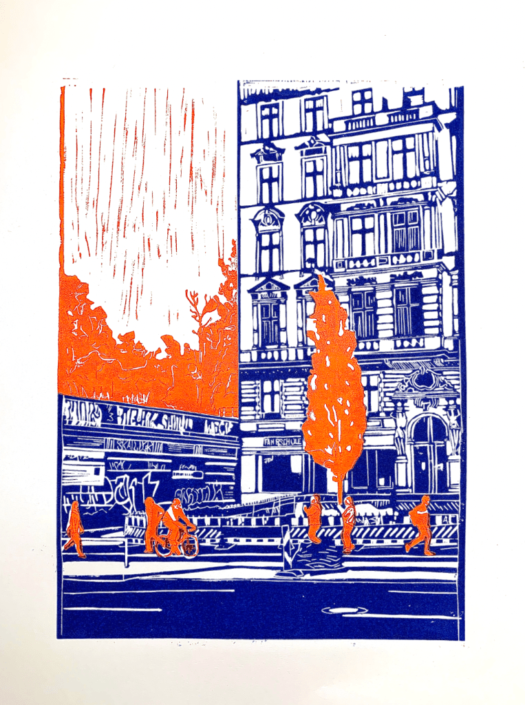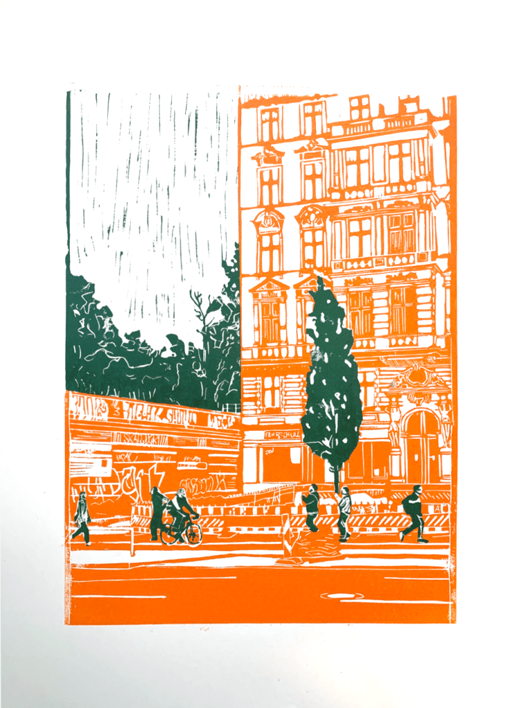 YORCKSTRASSE (blue, orange, green)_A3_linocut
