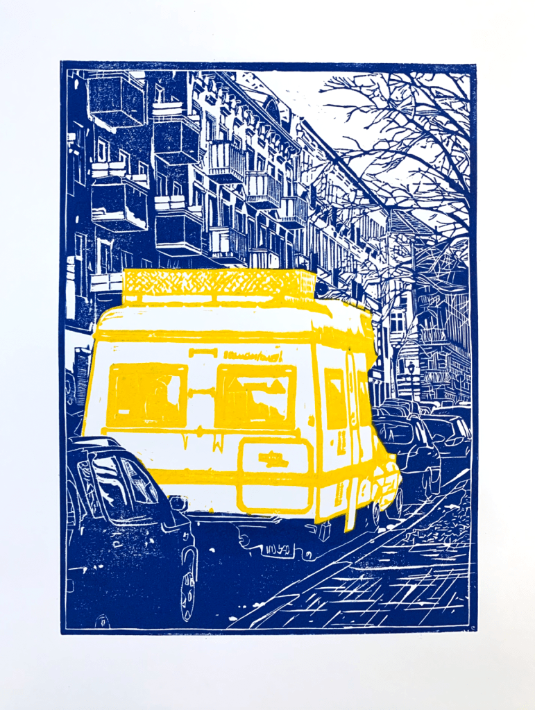 MOBILE UNTERKUNFT ( Yellow, blue, black) _A3_linocut