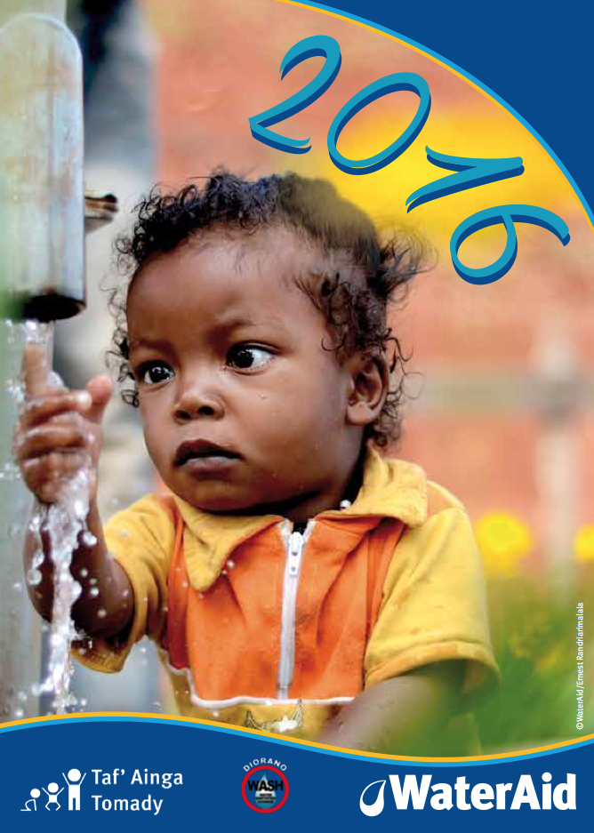 Réalisation d’un calendrier chevalet à 13 feuillets. La charte graphique a été fournie, ainsi que les photos qui sont de © WaterAid / Ernest Randriarimalala